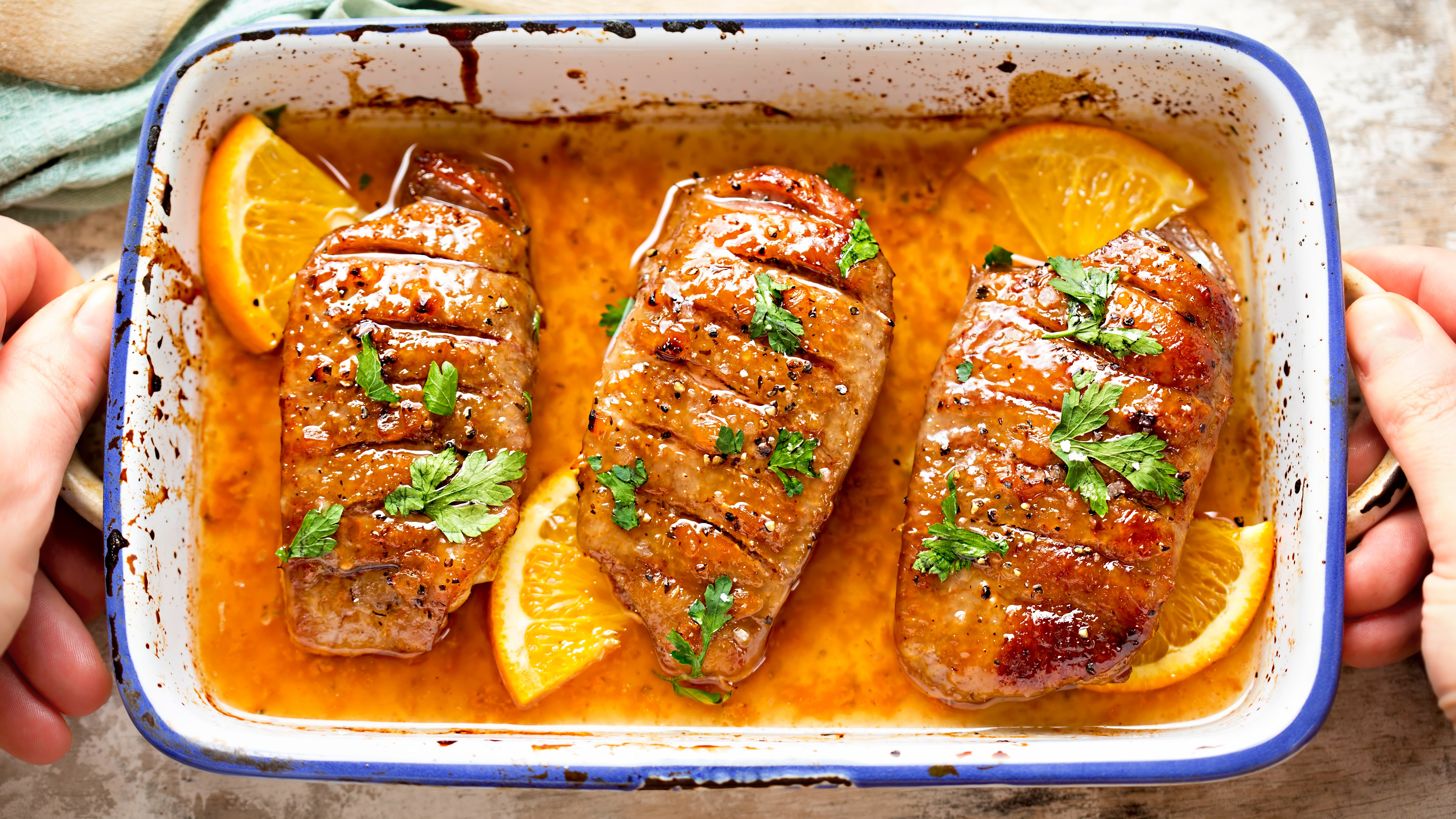 Von dem Bratensatz eventuell das Fett mit einem Löffel abnehmen oder abgießen. Orangensaft und –schale zu dem Bratensatz geben und aufkochen lassen. Creme Fraîche unterrühren und zum Kochen bringen. Die Soße mit Salz, Pfeffer und Honig abschmecken.