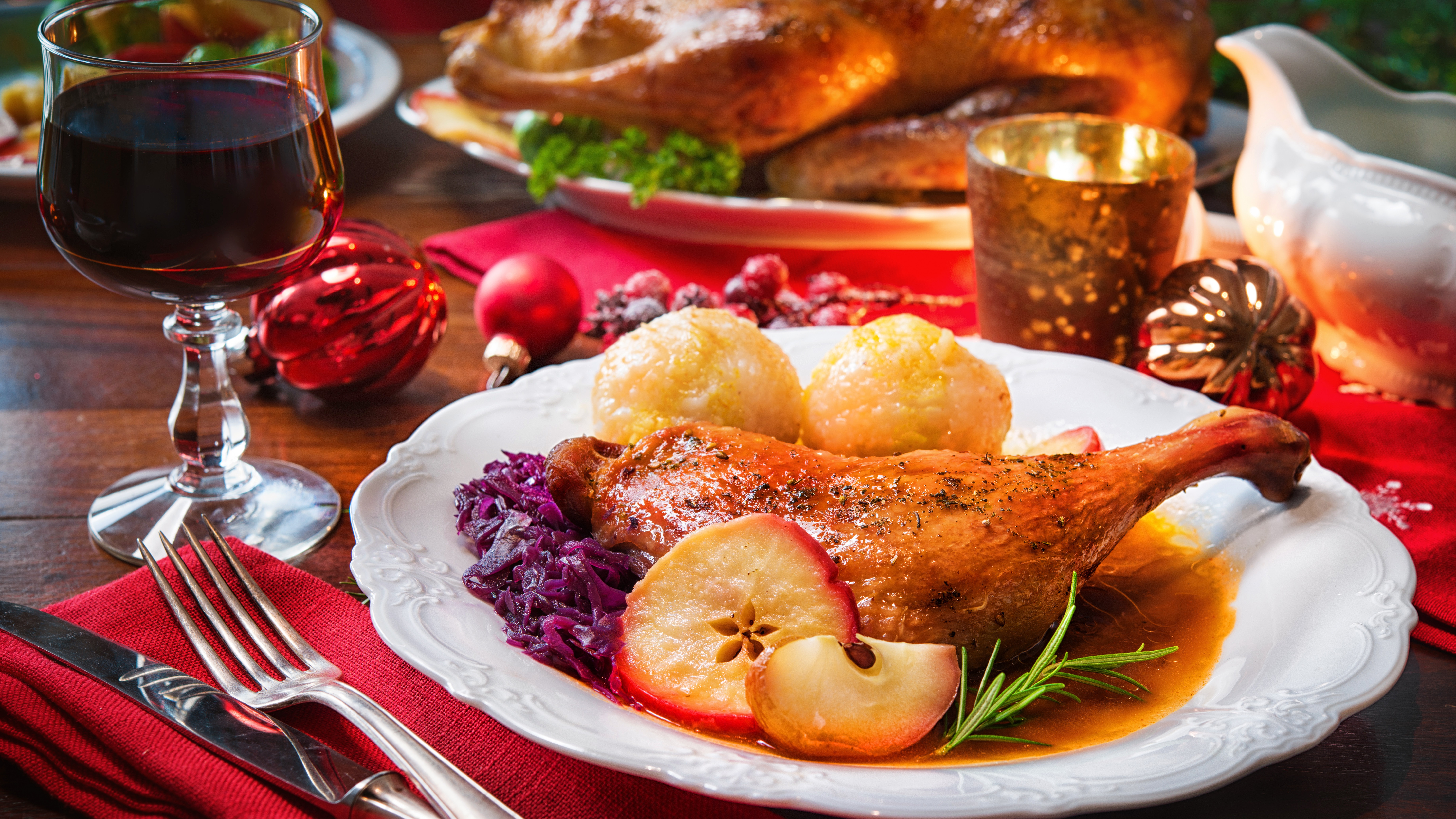 Nach ca. 45 Minuten die Keulen herausnehmen, bei zu wenig Flüssigkeit etwas Portwein angießen, die Schalotten schälen, vierteln, dazugeben, Tomatenmark, Honig und Orangenmarmelade einrühren, die Keulen wieder auf die Sauce legen und im geschlossenen Bräter weitere 60 Minuten schmoren lassen. Die Hitze auf 180° C reduzieren.