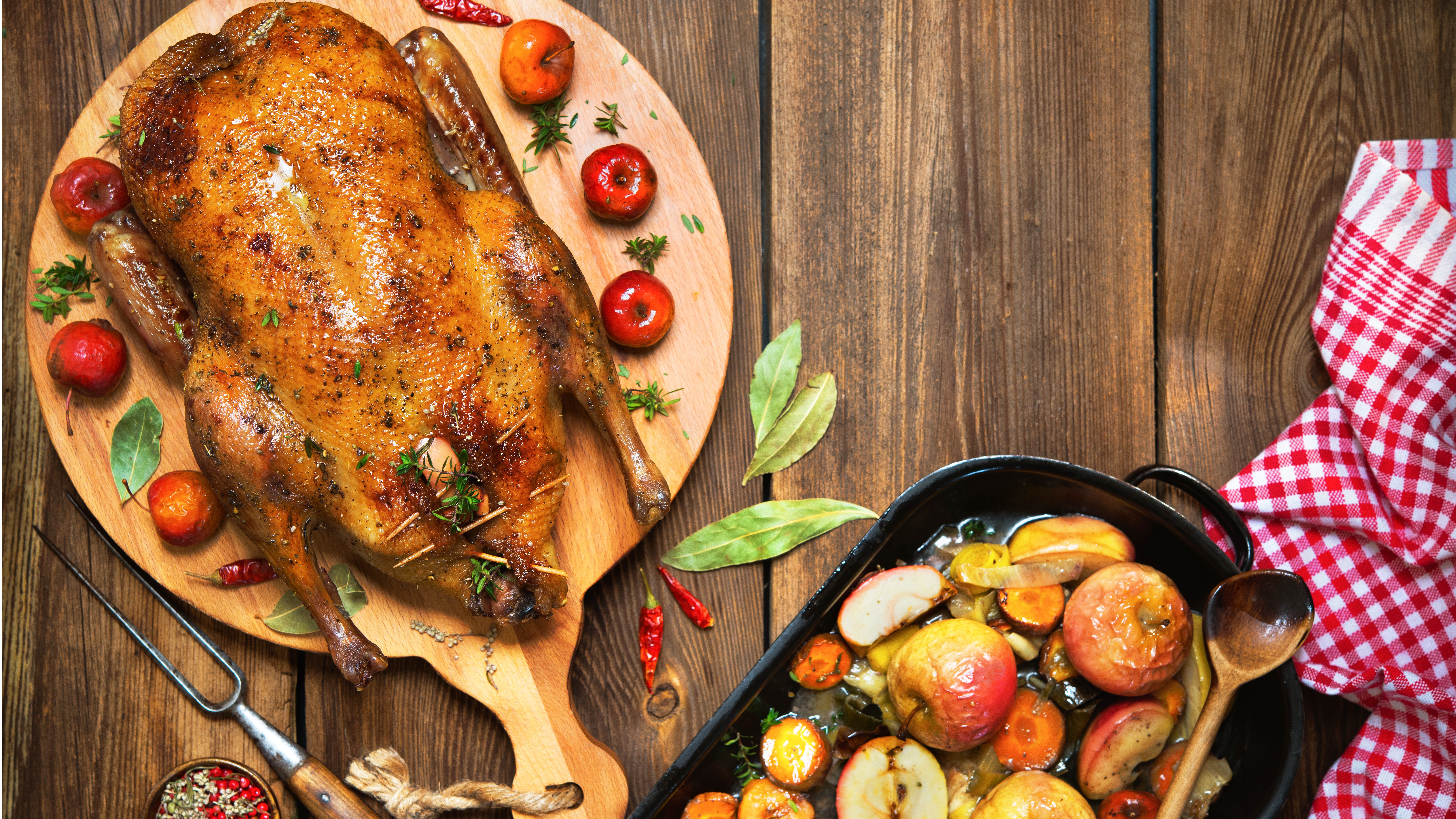 Die Entenkeulen von der Haut befreien, diese wegschmeißen. Keulen auf einen Teller legen, mit Alufolie abdecken und im ausgeschalteten Ofen warm stellen.